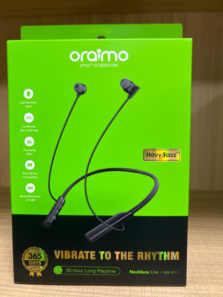 Découvrez le son puissant des écouteurs Bluetooth Oraimo Necklite. Dotés de basses intenses et de 30 heures d'autonomie, ils sont parfaits pour la musique non-stop. Idéal pour les appels mains libres avec réduction de bruit. Choix parfait pour les mélomanes actifs!