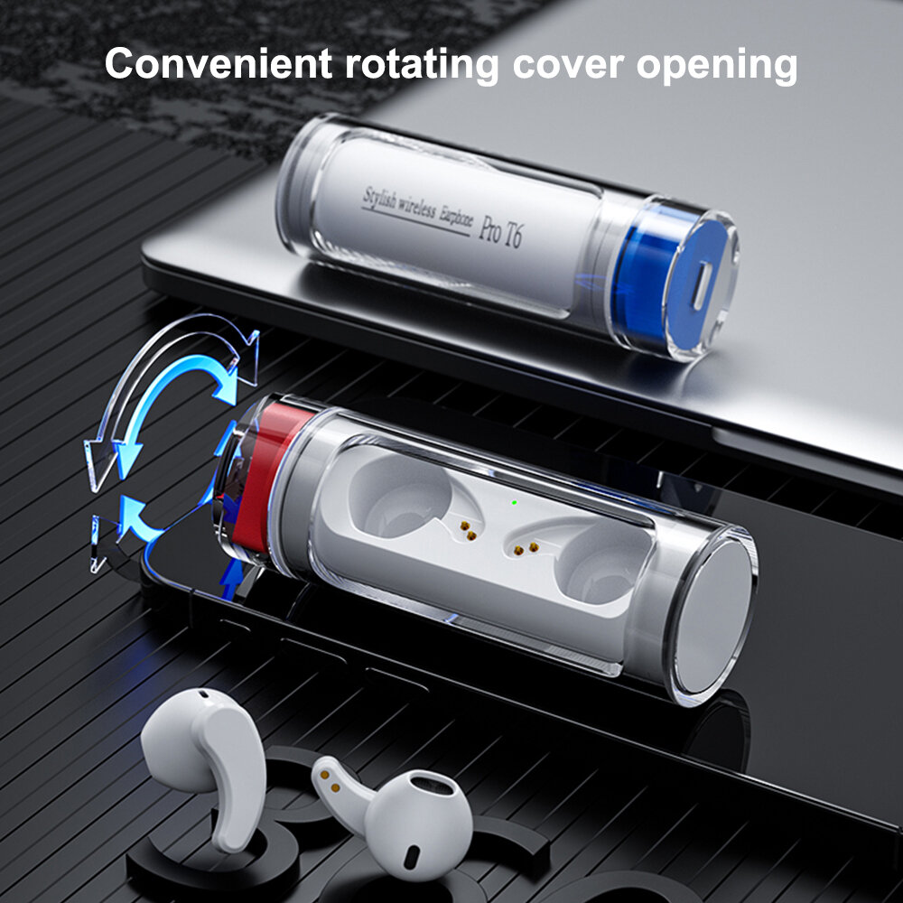 Découvrez les écouteurs Bluetooth Pro T6 avec boîtier rotatif pratique. Qualité sonore haute résolution et design transparent unique pour un confort optimal. Parfait pour une utilisation quotidienne, au travail ou en voyage. Compatibles avec tous les appareils Bluetooth.