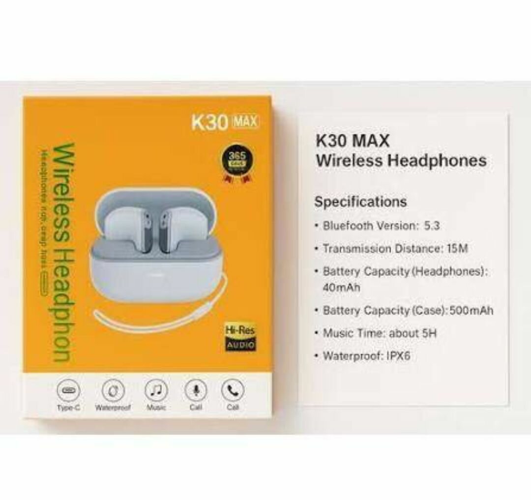 Découvrez les écouteurs sans fil K30 Max avec Bluetooth 5.3, portée de 15m, et étanchéité IPX6. Offrant 5 heures de musique ininterrompue, ils sont parfaits pour les déplacements et le sport.
