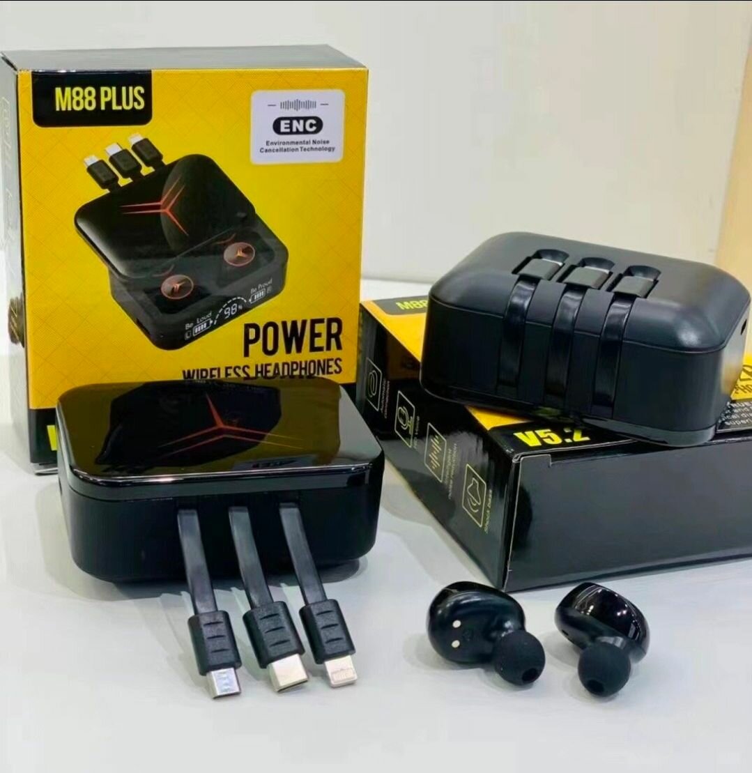 Découvrez les écouteurs sans fil M88 Plus avec ENC pour une expérience sonore exceptionnelle. Boîtier de charge avec câbles intégrés, idéal pour une mobilité sans contrainte. Parfait choix pour les audiophiles en déplacement.