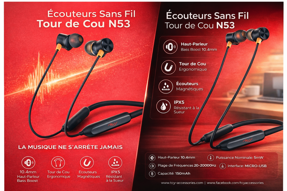 Découvrez les écouteurs sans fil tour de cou N53, offrant un son clair grâce à leurs haut-parleurs de 10.4mm. Avec leur conception ergonomique, ils garantissent un confort maximal pour une utilisation prolongée. Résistants à la sueur grâce à la norme IPX5, ils sont parfaits pour le sport. Profitez de basses puissantes et de l'autonomie prolongée lors de vos déplacements. Les écouteurs magnétiques assurent un rangement facile. Idéal pour écouter de la musique partout, tout le temps.