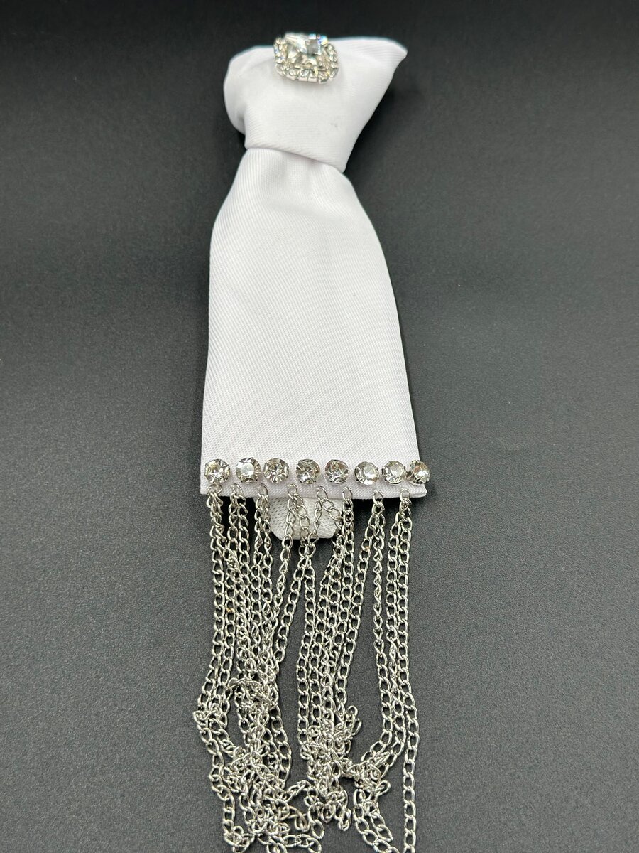 Enhance your formal attire with this elegant chain brooch tie. Featuring a sophisticated design, this white tie is adorned with a stunning jewel brooch and elegant chains for a unique touch. Perfect for weddings, formal events, or adding a dash of elegance to your look. Stand out with this luxurious accessory.