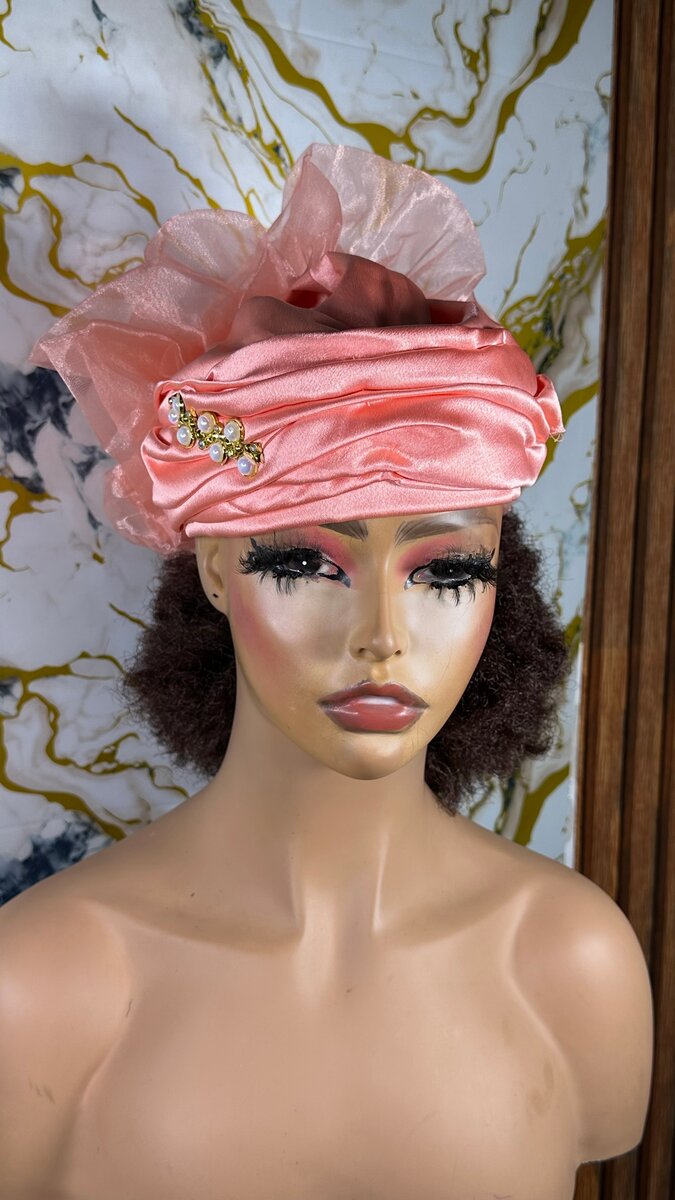 Élégant chapeau en satin rose avec broche cristal, parfait pour mariages et événements spéciaux. Design sophistiqué et confortable. Un ajout chic à votre garde-robe.