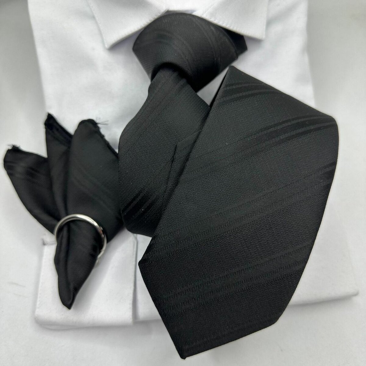 Cravate noire élégante en soie, idéale pour les événements formels et professionnels. Complétez votre look avec cette pièce intemporelle et sophistiquée. Parfait pour les réunions de bureau, mariages et autres occasions spéciales. Conçue pour apporter une touche finale chic à toute tenue de costume.
