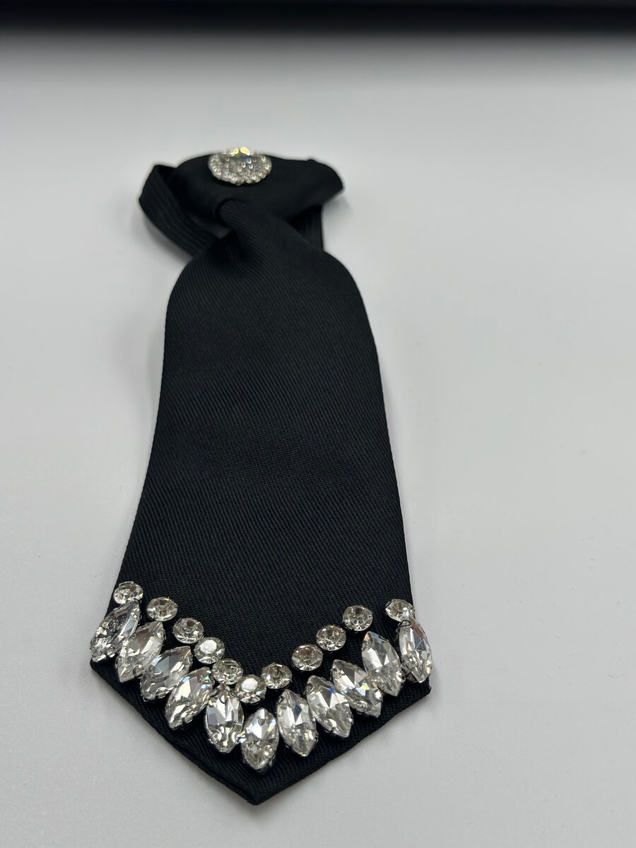 This stunning black tie is adorned with sparkling crystals for a touch of luxury. Perfect for formal occasions, it adds a sophisticated flair to any outfit. Ideal for weddings, gala events, and upscale dinners. Crafted for style and elegance, this accessory is a must-have for a distinguished look.