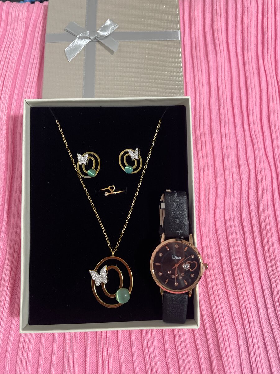 Optez pour cet ensemble de bijoux raffiné et montre élégante, parfait pour sublimer votre tenue. Le set comprend un collier, des boucles d'oreilles et une montre chic au design intemporel. Idéal pour les occasions spéciales ou comme cadeau inoubliable.