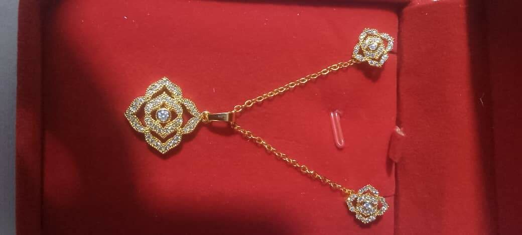 This exquisite gold jewelry set features a stunning pendant and matching earrings, perfect for special occasions. Designed with intricate detailing, the set adds a touch of luxury to any ensemble. Ideal for weddings or festive events, it makes a sophisticated gift or a personal indulgence. Crafted for elegance and style.