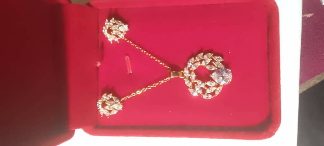 This stunning jewelry set features a beautifully crafted necklace and earrings, embellished with sparkling crystals. Perfect for special occasions or as a thoughtful gift, this set adds a touch of elegance to any outfit. Make a statement with its exquisite design and fine craftsmanship.
