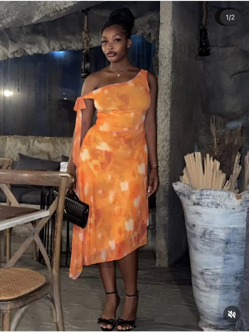 Stand out in this vibrant one-shoulder dress, featuring a stunning orange pattern. Perfect for cocktails or summer events, its asymmetrical design and lightweight fabric ensure comfort and style. A must-have addition to your wardrobe for any special occasion.