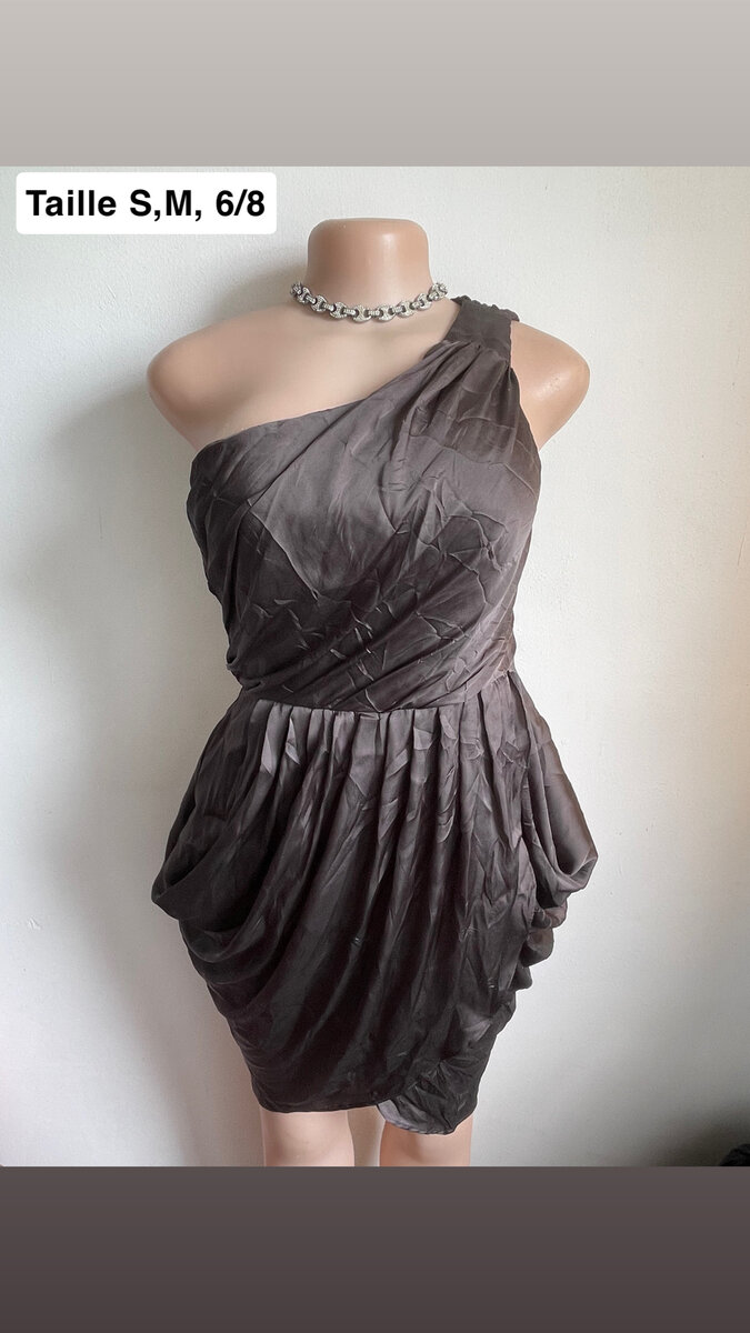 Chic and stylish gray one-shoulder dress perfect for events. Flattering draped design fits sizes S-M. Ideal for parties, weddings, or evening outings. Enhance your look with this sophisticated piece!