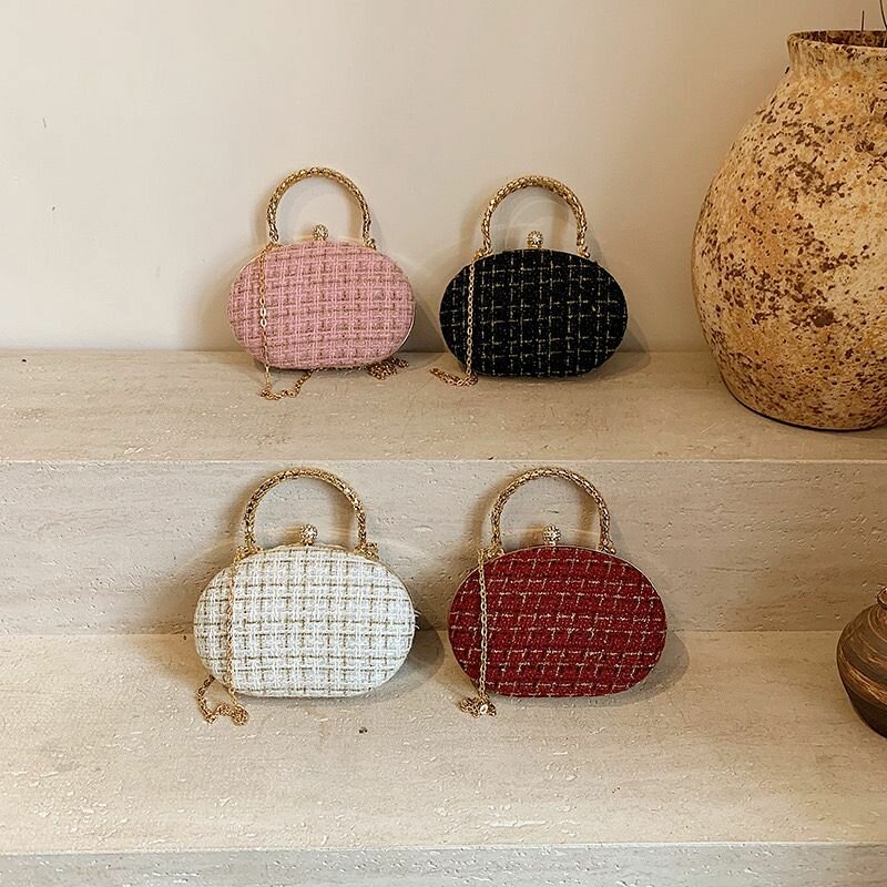 Optez pour un style chic avec ce sac ovale en tweed. Son design unique et sa chaîne dorée ajoutent une touche sophistiquée à votre tenue. Parfait pour les soirées, il offre suffisamment d'espace pour vos essentiels. Disponible en plusieurs couleurs, ce sac est idéal pour celles qui veulent allier modernité et élégance. Un must-have pour toute fashionista!