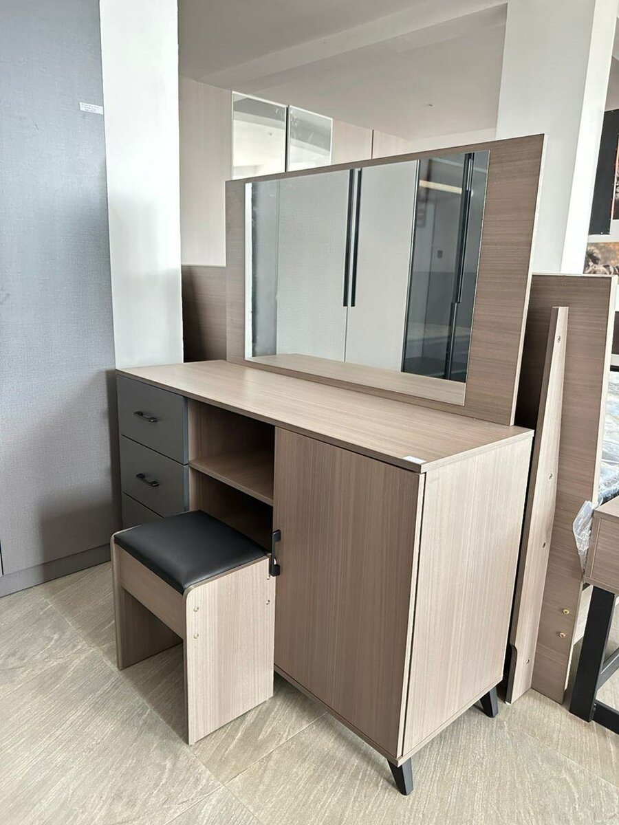 Upgrade your bedroom with this elegant vanity set featuring ample storage and a large mirror. Perfect for makeup, skincare, or styling hair, it's a must-have for any beauty enthusiast. Stylish stools complete the look.