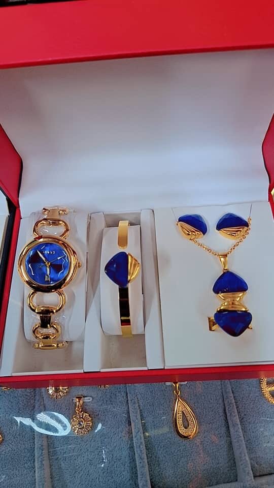 This stunning set features an elegant watch paired with matching jewelry pieces. Crafted with intricate designs and vibrant stones, it's perfect for those who value luxury and style. Ideal for special occasions or a luxurious gift. Made with high-quality materials ensuring durability and timeless elegance.