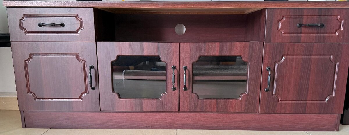 Enhance your living room with this elegant wooden TV stand. Designed with spacious storage, it features glass doors for a stylish display. Perfect for organizing your media essentials. Ideal for modern and classic home interiors.