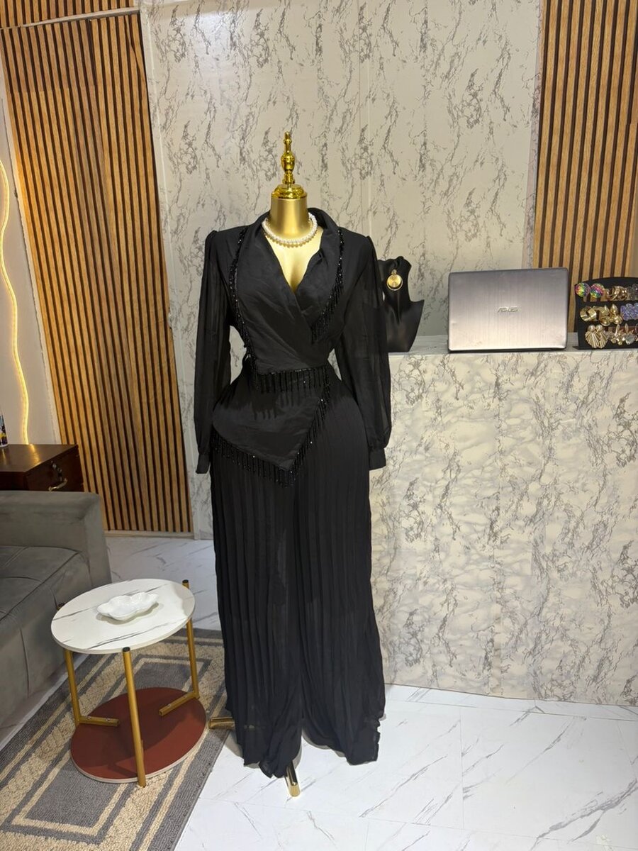 Sublimez votre allure avec cette élégante combinaison noire, idéale pour soirées et événements spéciaux. Confectionnée avec des détails raffinés, elle offre un style chic et sophistiqué. Parfaite pour un look glamour.