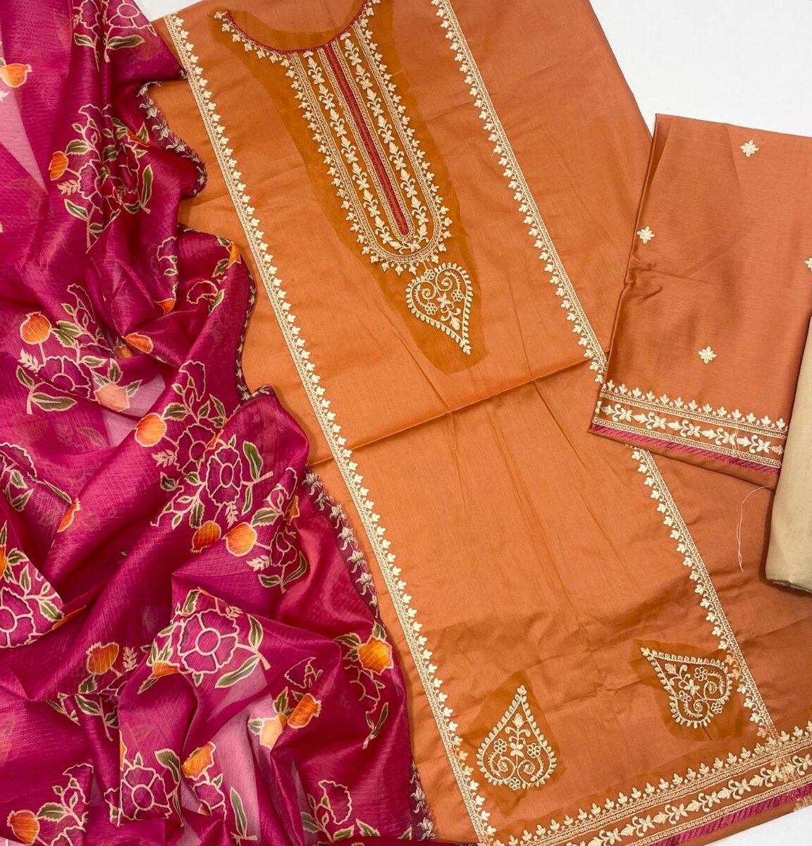 Elegant Orange Embroidered Lawn Suit with Floral Dupatta