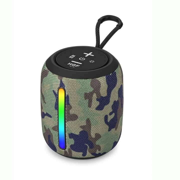 Profitez d'une expérience sonore exceptionnelle avec cette enceinte Bluetooth portable au design camouflage. Parfaite pour les aventures en plein air, elle offre une connectivité sans fil et des effets lumineux LED intégrés. Compacte et robuste, cette enceinte est idéale pour les sorties en nature ou les fêtes entre amis. Facile à transporter grâce à sa sangle, elle deviendra votre compagnon musical incontournable.