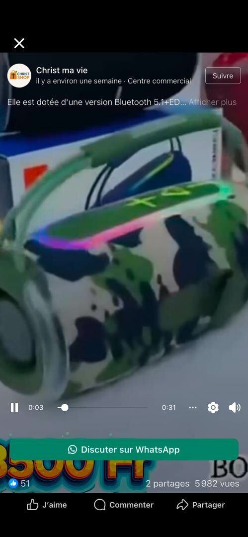 Profitez de votre musique partout avec cette enceinte Bluetooth au design camouflage. Dotée de la version Bluetooth 5.0, elle offre un son clair et puissant. Idéale pour les aventures en plein air, les fêtes ou simplement écouter de la musique à la maison. Design moderne avec effets lumineux LED!