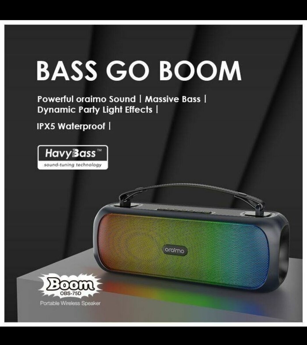 Plongez dans un son puissant avec l'enceinte Bluetooth Oraimo Boom. Profitez de basses profondes, d'effets lumineux dynamiques et d'une résistance à l'eau IPX5 pour toutes vos fêtes. Parfaite pour les soirées et les sorties.