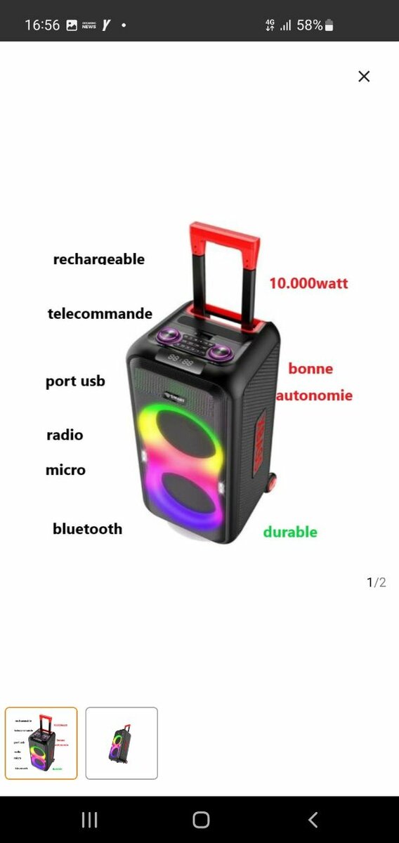 Profitez de votre musique partout avec cette enceinte Bluetooth de 10.000 watts. Rechargeable et durable, elle offre une excellente autonomie. Dotée de ports USB, radio et micro, elle inclut aussi une télécommande pour un contrôle facile. Idéale pour les fêtes, événements ou simplement à la maison, c'est le choix parfait pour un son de qualité.