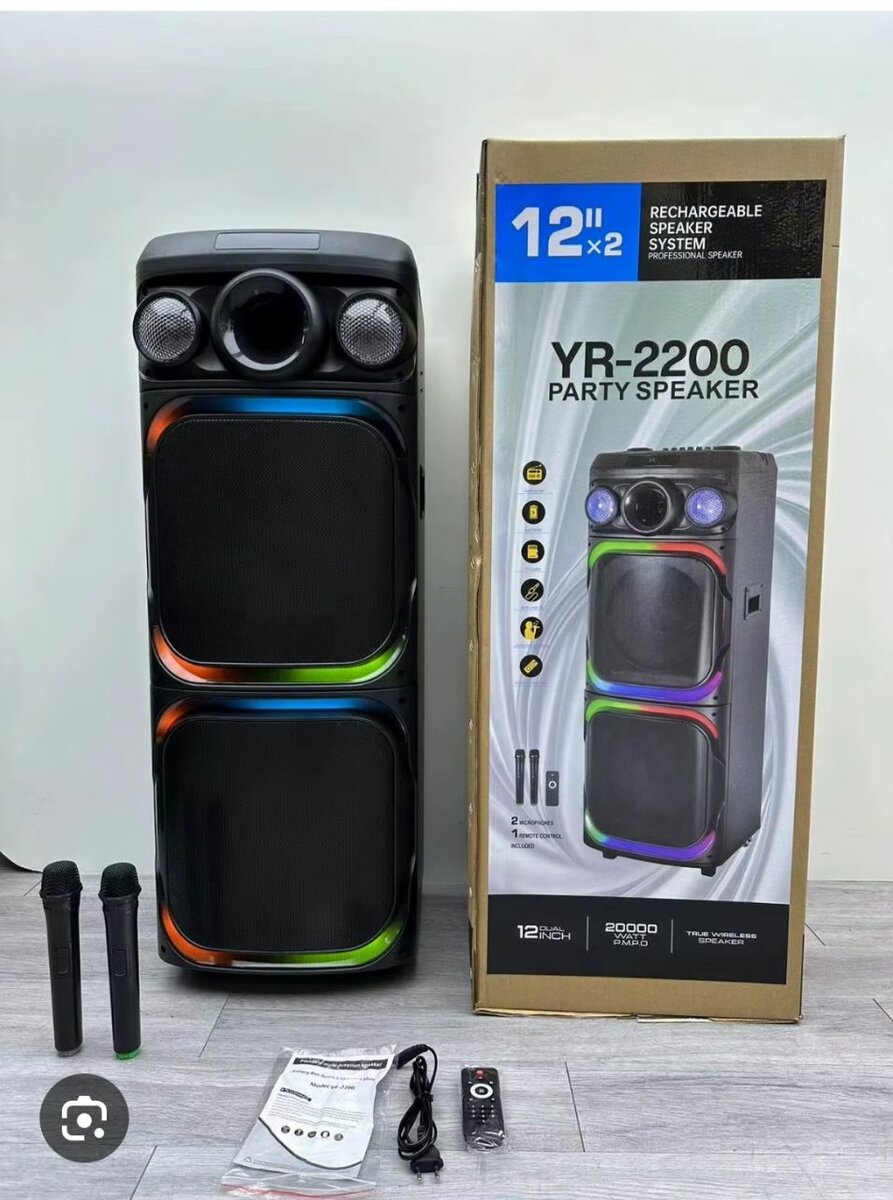 Profitez d'un son puissant avec l'enceinte YR-2200. Idéale pour vos soirées, elle offre des lumières LED vibrantes et une utilisation sans fil avec télécommande. Parfait pour les événements, à la maison ou en extérieur. Rechargeable et facile à déplacer, elle garantit une ambiance exceptionnelle partout où vous allez.