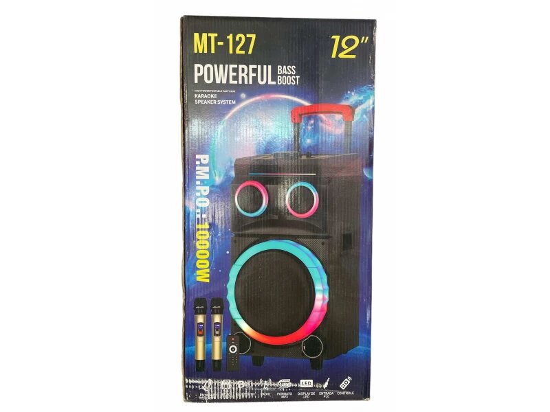 Découvrez l'enceinte karaoke MT-127 avec renforcement des basses et une puissance de 10000W. Profitez de vos soirées avec un son exceptionnel et des effets de lumière LED. Connectivité Bluetooth et USB, idéale pour les fêtes et événements.