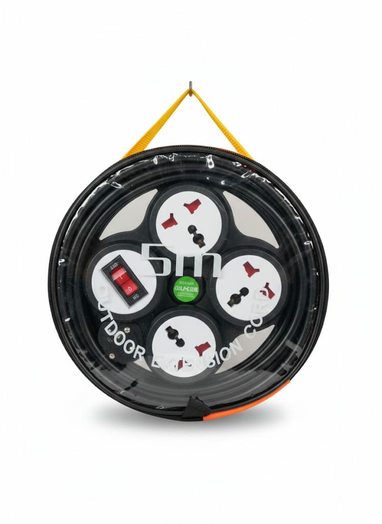 Enrouleur de câble électrique robuste pour usage extérieur avec plusieurs prises et protection thermique. Idéal pour le jardin et le bricolage en toute sécurité.