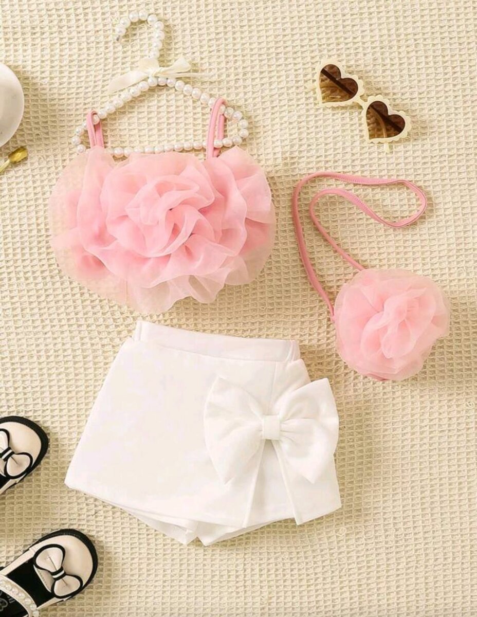 Ensemble de 3 pièces Fillette élégante, avec haut floral rose, sac bandoulière et impression amusante pour loisirs de printemps/été