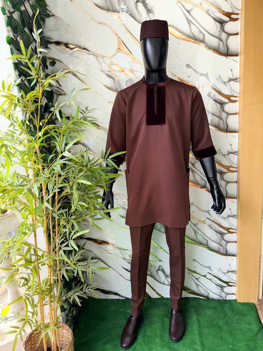 Découvrez cet ensemble africain élégant, parfait pour toutes occasions spéciales. Conçu dans un tissu confortable avec des détails en velours au niveau du col et des manchettes, il allie tradition et modernité. Idéal pour un look sophistiqué et unique.