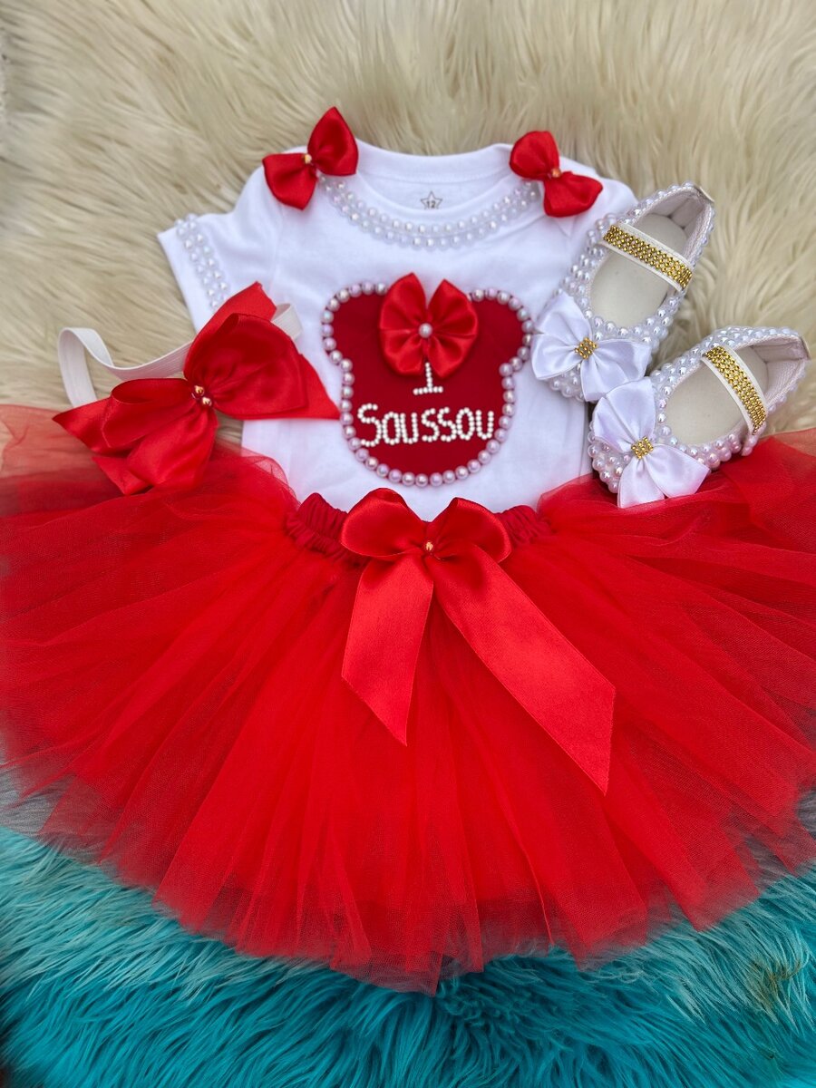 Parfait pour une célébration d'anniversaire. Comprend un haut personnalisé, une jupe tutu rouge éclatante et des chaussures assorties.
