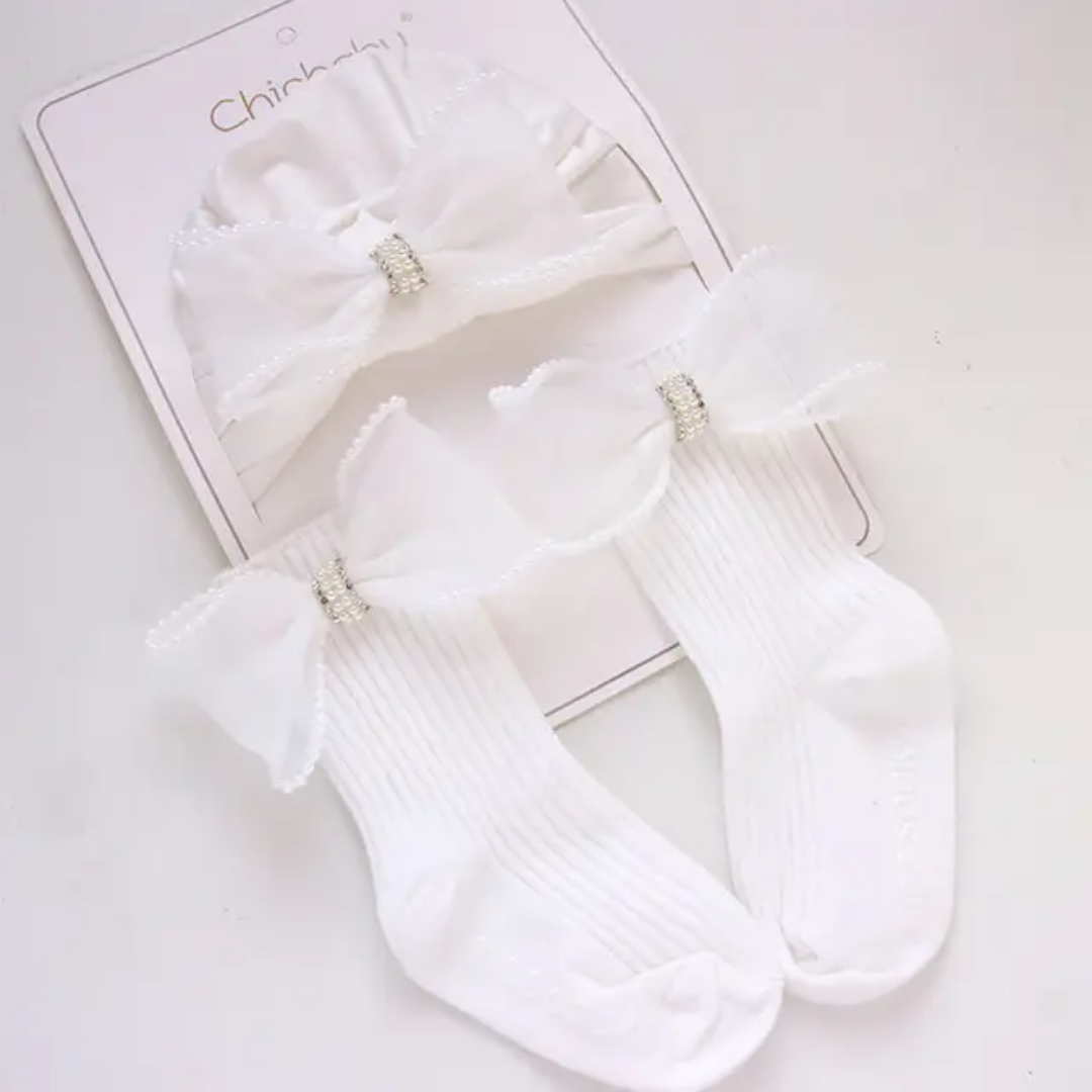 Adorable ensemble de chapeau et chaussettes pour bébé avec noeuds décoratifs. Confort et style pour les petits, parfait pour les occasions spéciales ou comme cadeau de naissance.