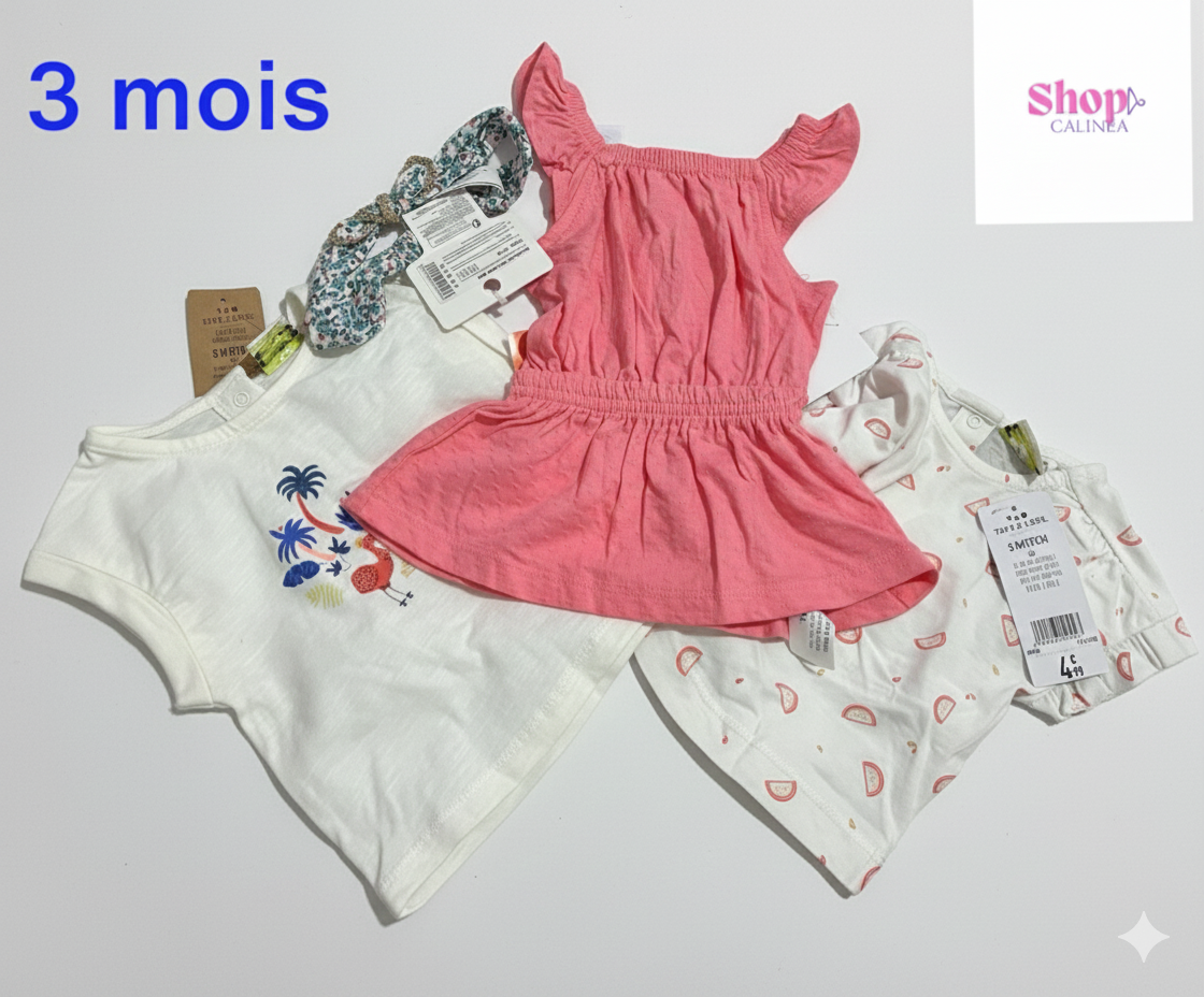 Cet adorable ensemble pour bébé de 3 mois inclut une robe rose élégante, un t-shirt imprimé et un short à motifs, parfait pour les journées estivales. Confortable et stylé, idéal pour le quotidien ou les occasions spéciales.