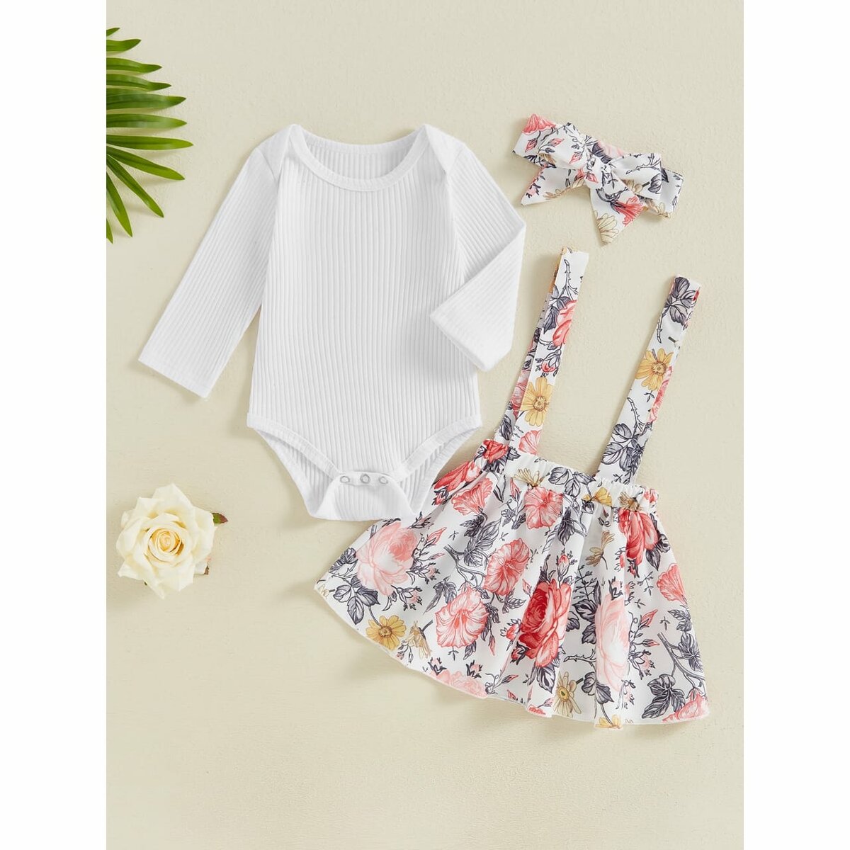 Adorable ensemble bébé trois pièces avec body côtelé blanc, jupe à bretelles à motifs floraux et bandeau assorti. Parfait pour des occasions spéciales ou pour ajouter une touche charmante au quotidien de votre bébé. Fabriqué avec des matériaux doux et confortables pour la peau délicate des tout-petits.
