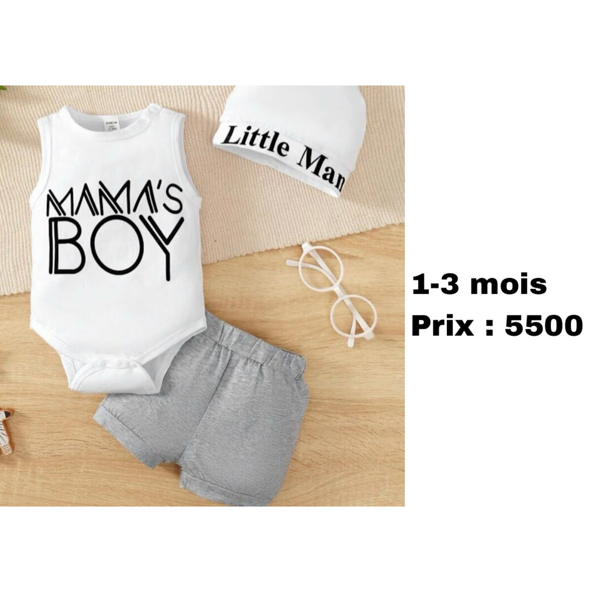 Adorable ensemble pour bébé garçon, idéal de 1 à 3 mois. Inclut un body, un short confortable et un bonnet mignon. Parfait pour les sorties et photos souvenirs. Offrez à votre petit une tenue stylée et confortable, parfaite pour toutes occasions.