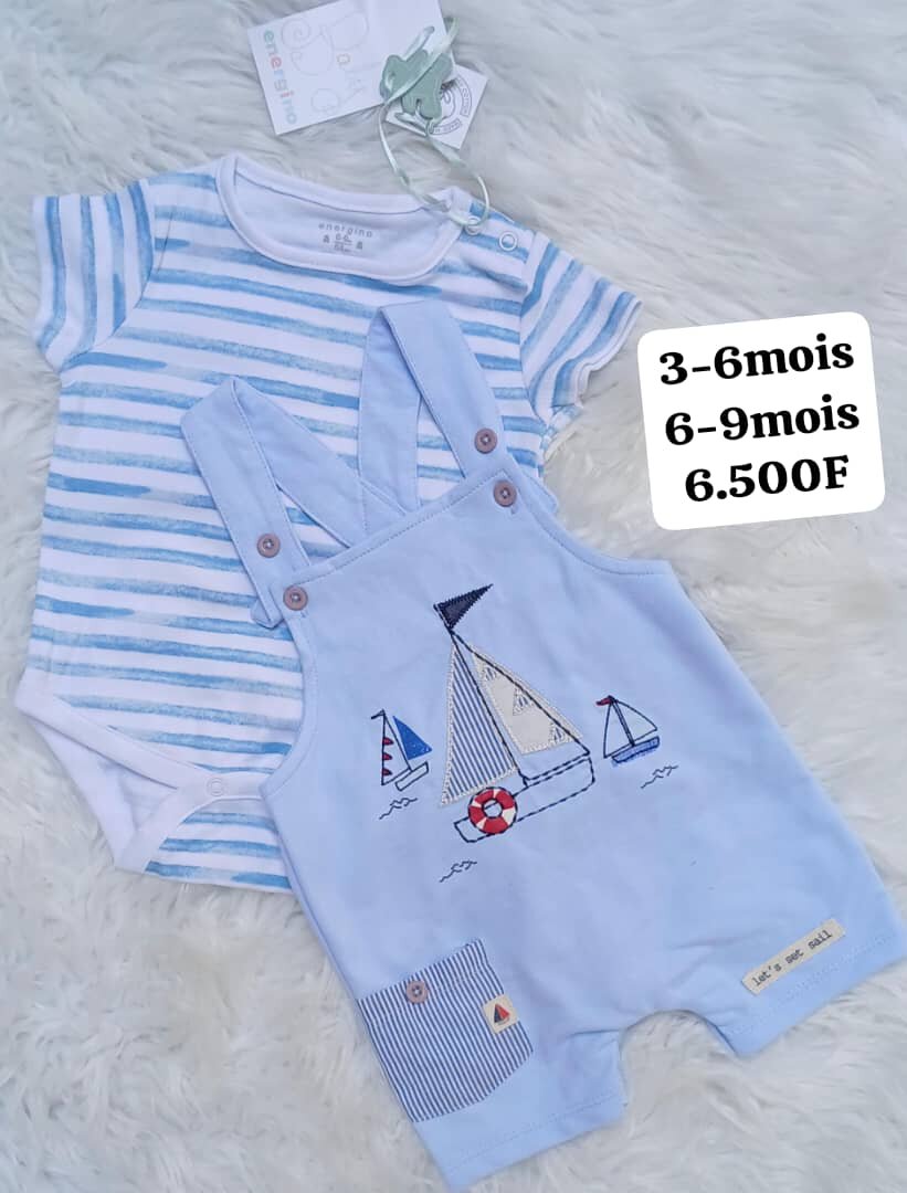 Adorable ensemble de vêtements pour bébé, parfait pour les mois d'été. Comprend une combinaison à rayures bleues et blanches et une salopette avec motif bateau. Confortable et idéal pour les petits aventuriers.