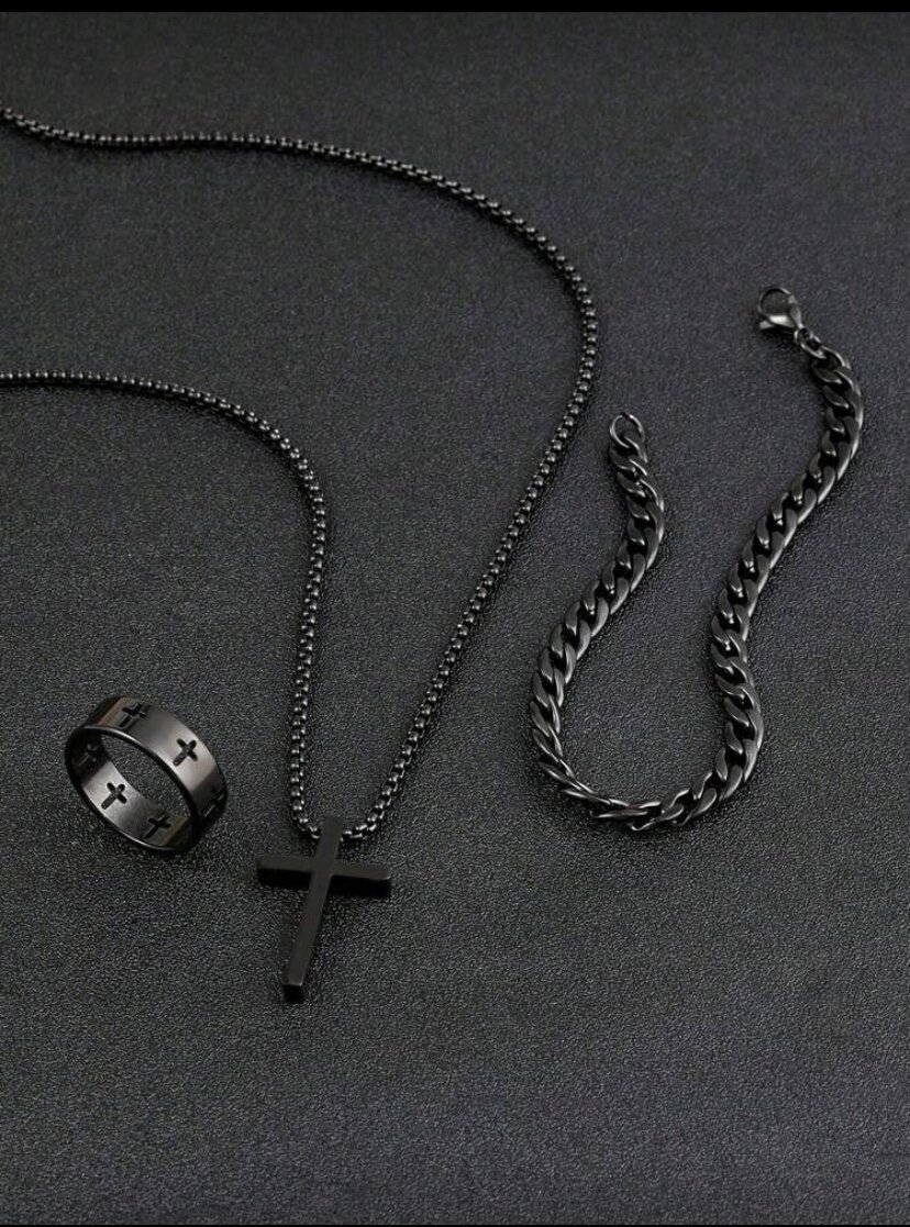 Cet ensemble élégant comprend un collier, un bracelet et une bague en acier inoxydable noir avec motif croix. Parfait pour un look moderne et affirmé. Résistant et intemporel, idéal pour toute occasion.