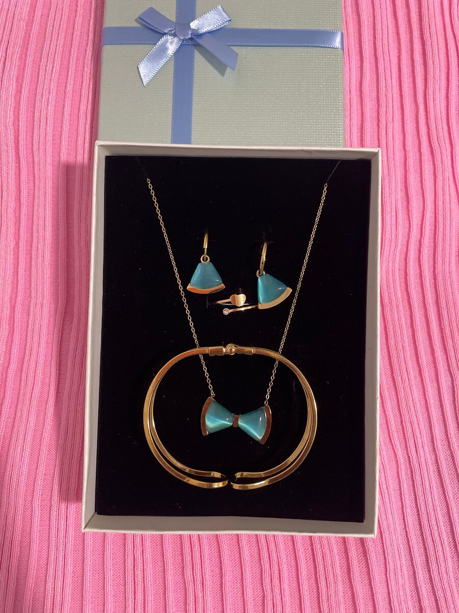 Magnifique ensemble de bijoux en doré et turquoise comprenant un collier, des boucles d'oreilles et un bracelet. Parfait pour sublimer vos tenues avec une touche d'élégance et de couleur. Idéal pour des occasions spéciales ou comme cadeau.