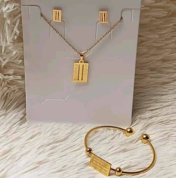 Magnifique ensemble de bijoux dorés comprenant collier, boucles d'oreilles et bracelet. Design raffiné parfait pour soirées et événements spéciaux. Idéal cadeau sophistiqué.