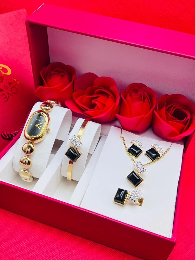 Élégant ensemble bijoux et montre comprenant un collier raffiné, des boucles d'oreilles scintillantes, une bague chic, et une montre sophistiquée. Chaque pièce est ornée de détails noirs et dorés, parfaits pour les occasions spéciales et les tenues distinguées.