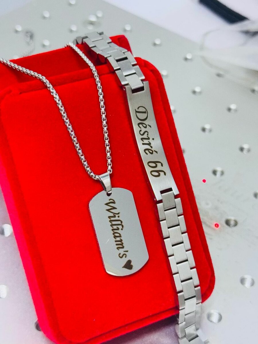 Découvrez notre ensemble de bijoux personnalisés en acier inoxydable. Comprend un bracelet et un collier, idéal pour offrir un cadeau unique. Parfait pour toutes occasions, ces pièces élégantes ajoutent une touche personnelle à votre style. Résistant et durable, c'est un choix parfait pour montrer votre individualité.