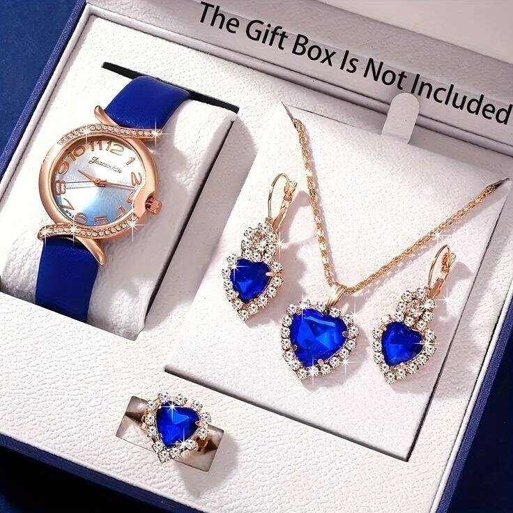 Distinguez-vous avec cet ensemble bijou comprenant montre, collier, boucles d'oreilles et bague sertis de pierres bleu saphir éclatantes. Idéal pour les occasions spéciales ou pour ajouter une touche de glamour à votre tenue quotidienne.