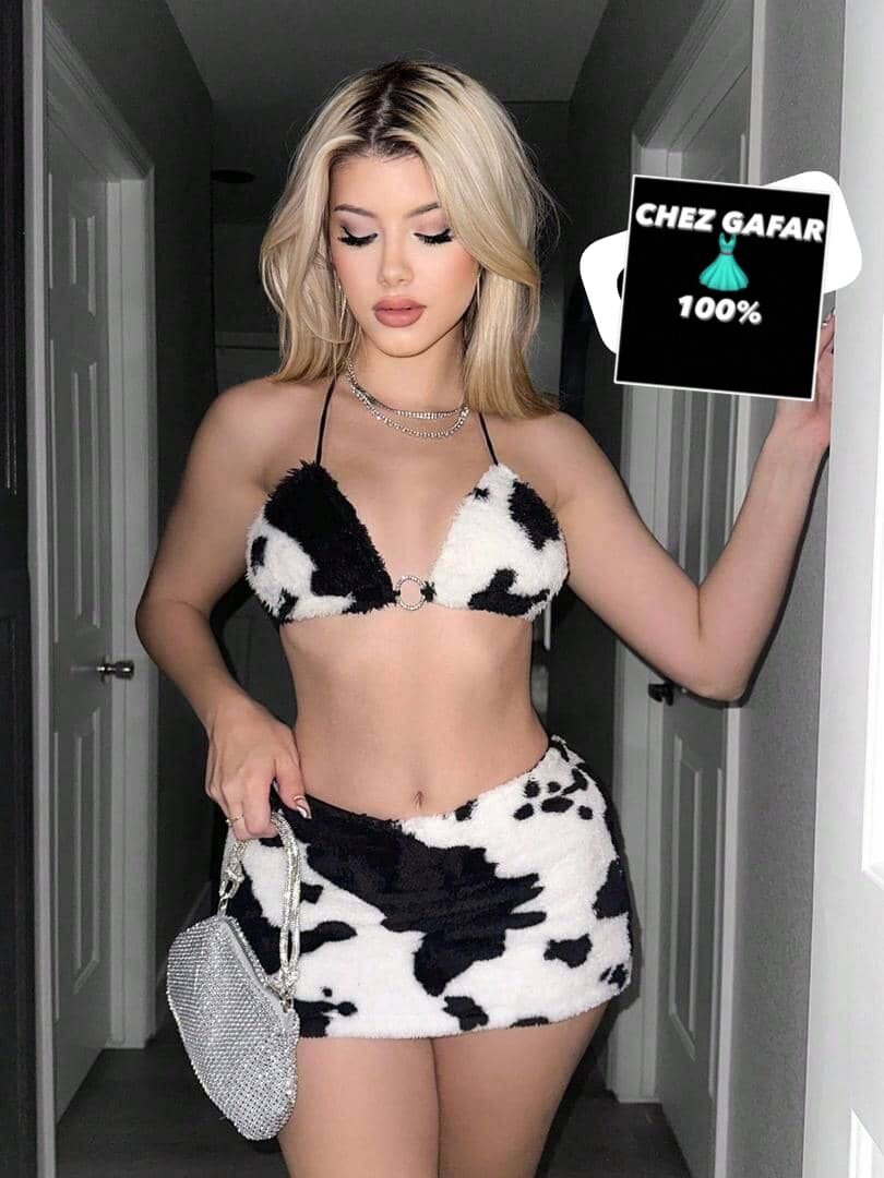 Découvrez cet ensemble bikini unique à imprimé vache, parfait pour vos journées à la plage. Conçu pour allier style et confort, il est idéal pour se démarquer. Complétez votre look avec des accessoires scintillants pour une touche glamour supplémentaire.