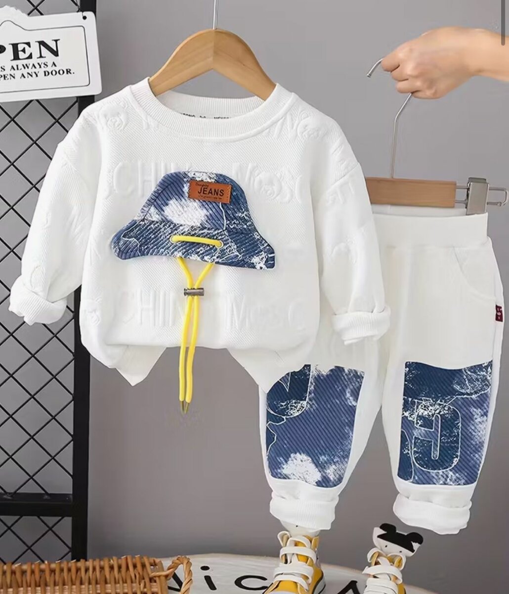 Cet ensemble confortable comprend un sweat-shirt et un pantalon blanc, parfait pour un look décontracté et chic. Fabriqué en coton doux, idéal pour la peau délicate des enfants. Un choix élégant pour toutes les occasions.