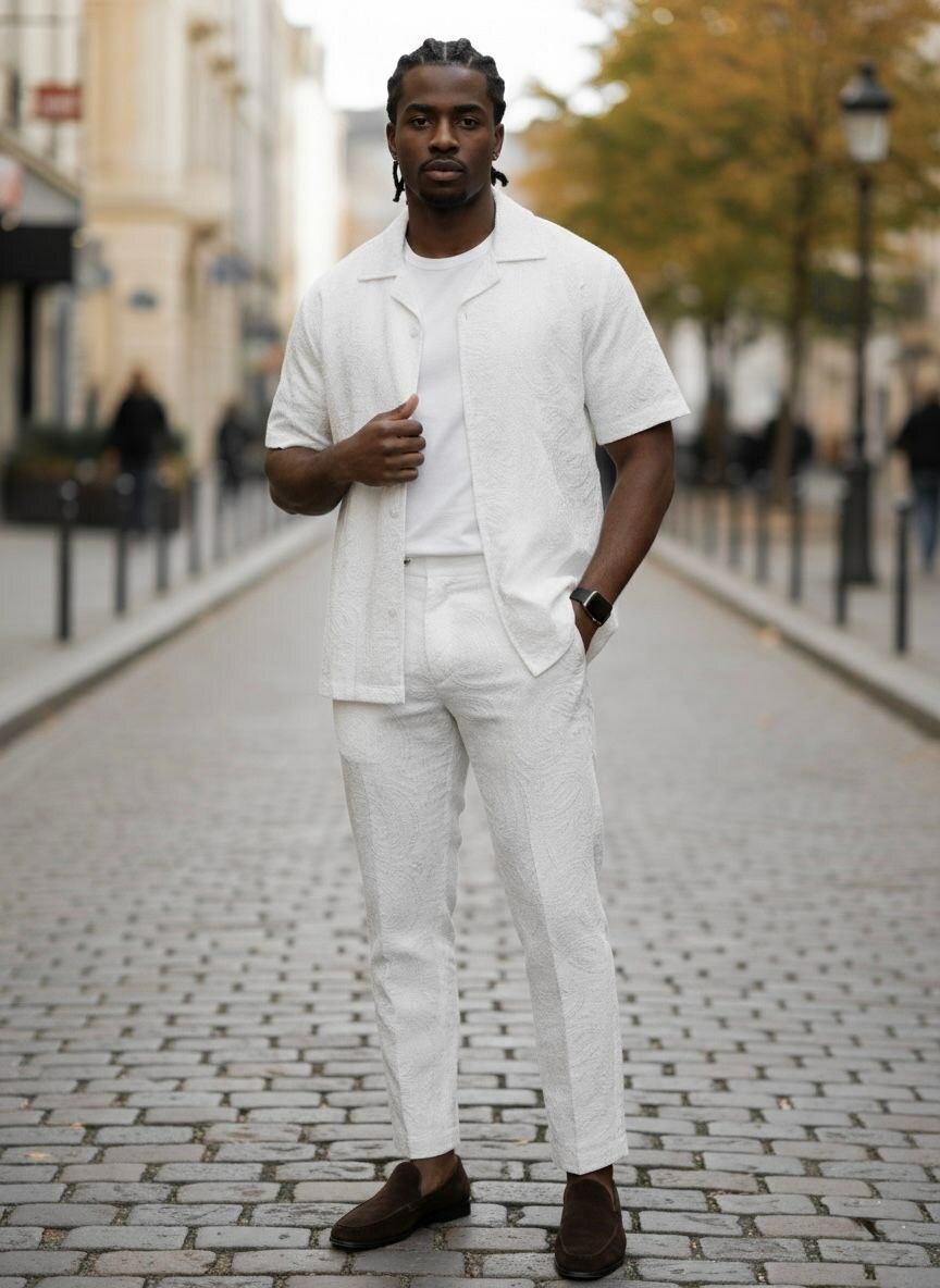 Adoptez un style chic et moderne avec cet ensemble deux pièces pour homme. Parfait pour les occasions estivales, sa texture légère assure confort et élégance. Idéal pour les sorties décontractées ou les événements formels en plein air. Sublimez votre garde-robe avec ce choix polyvalent et tendance.