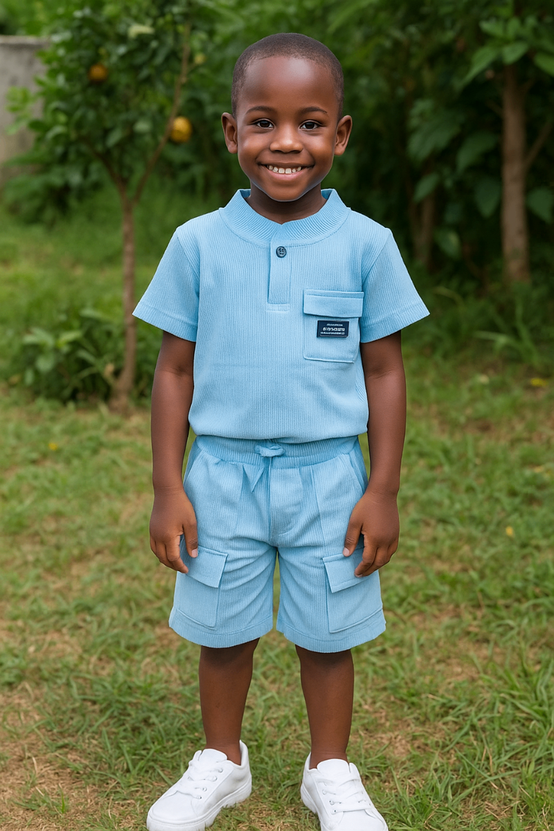 Adorable ensemble pour garçons composé d'un t-shirt et d'un short bleus. Parfait pour les journées d'été, fabriqué avec des matériaux confortables et respirants. Donnez à votre enfant le style et le confort qu'il mérite.