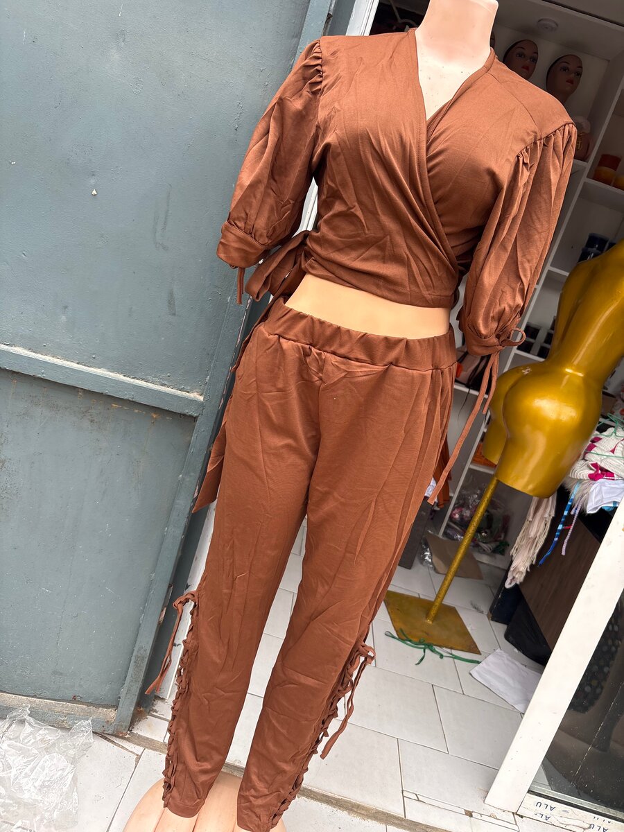Ensemble élégant avec blouse croisée et pantalon ajusté en brun terre cuite. Conçu pour un confort optimal, parfait pour les sorties décontractées ou professionnelles. Le tissu léger assure une aisance de mouvement.