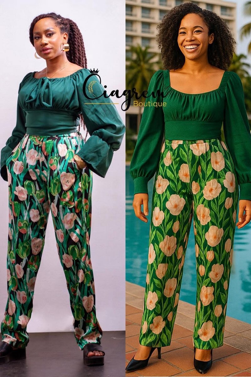 Cet ensemble élégant comprend une blouse verte à manches longues et un pantalon à motif floral vibrant. Parfait pour les occasions spéciales ou un look chic au quotidien. Tissu de haute qualité offrant confort et style. Idéal pour se démarquer en toute saison.
