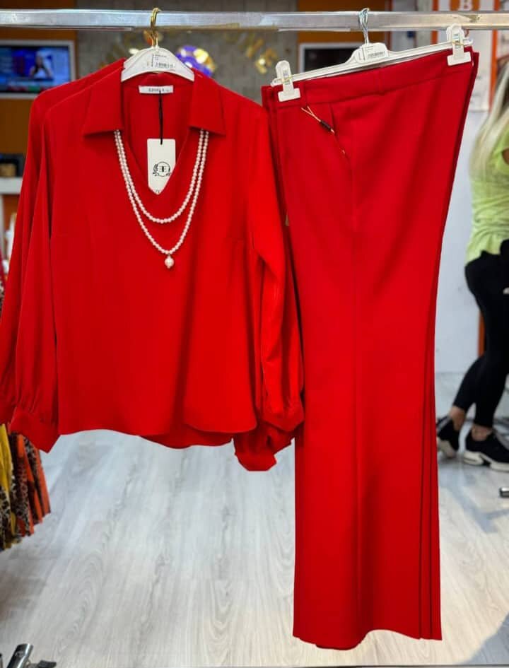 Élégant ensemble blouse et pantalon rouge, idéal pour un look professionnel et stylé. Confectionné dans un tissu de qualité, ce duo offre confort et sophistication pour vos journées au bureau ou vos événements élégants. La blouse présente une coupe ample avec un col classique, tandis que le pantalon est droite et flatteur. Parfait pour les femmes modernes qui cherchent à allier style et aisance.