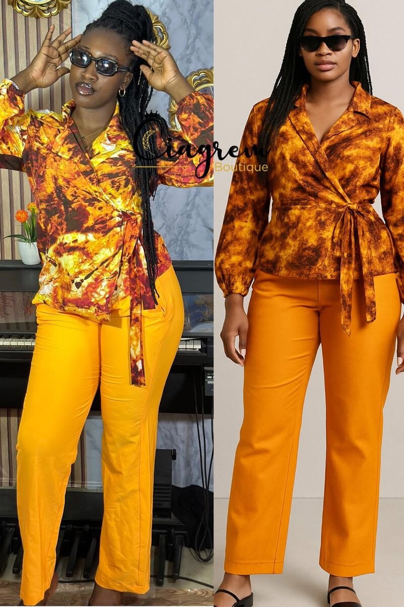 Optez pour cet ensemble blouse et pantalon aux teintes éclatantes pour un look audacieux. Confort et style se marient parfaitement, idéal pour une sortie ou un événement spécial. Fabrication de haute qualité avec attention aux détails, cet ensemble assure une allure chic et moderne.