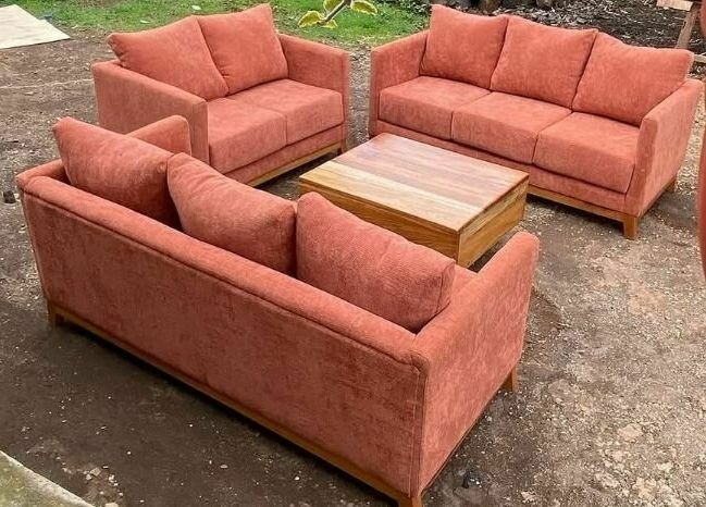 Ensemble canapé 4 places en velours rouge comprenant un canapé trois places et deux fauteuils, table basse en bois. Conçu pour le salon, cet ensemble est idéal pour créer un espace confortable et élégant.